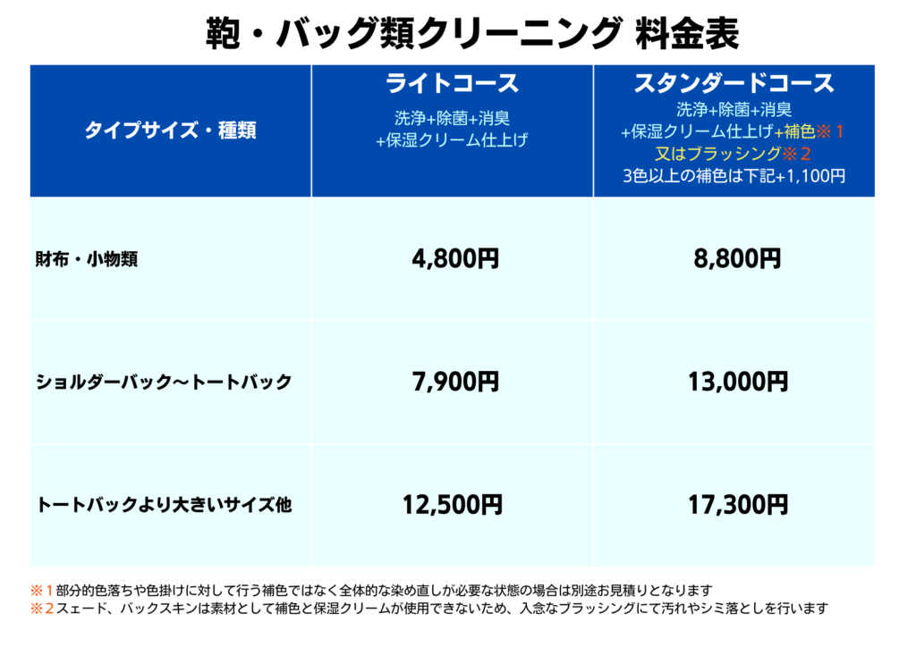 ※財布・鞄の状態及び素材により異なり、補色のできない素材はブラッシングによって汚れを落とします